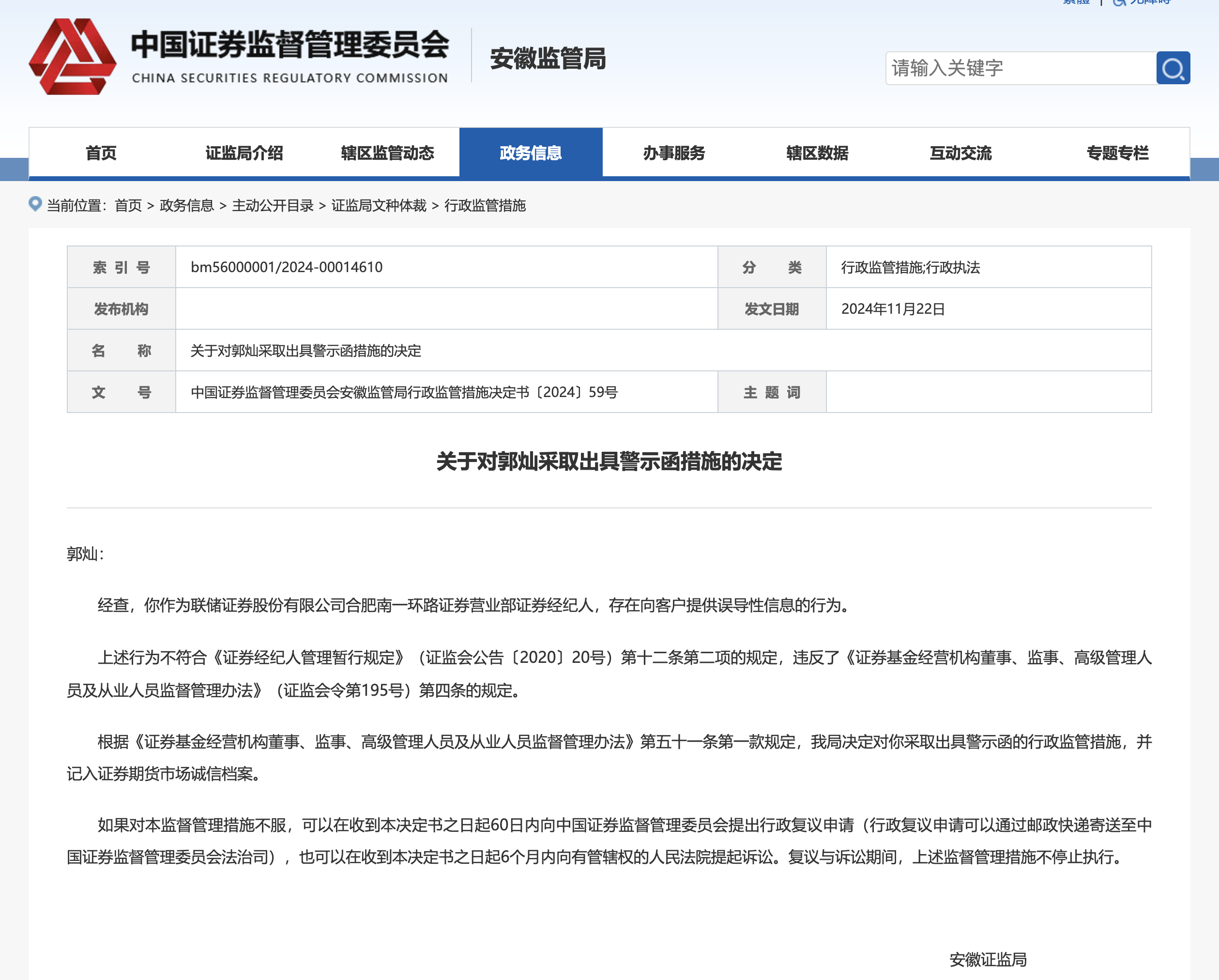 联储证券一营业部员工被出具警示函:向客户提供误导性信息银河策略联储证券一营业部员工被出具警示函:向客户提供误导性信息