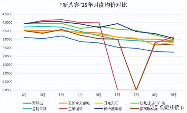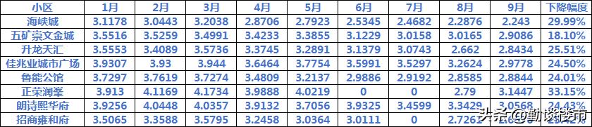 各小区几年价格下降幅度来看,基本上下降15%左右,正荣润峯最高点均价与最低点均价差距达33.15%,8月成交了2套户型和楼层较差房源的原因,9月回归正常价格,如果按九月算,均价下降幅度为24.65%;海峡城还是以29.99%的降幅位居第一。成交均价方面,正荣润峯排名第一,朗诗熙华府和佳兆业紧随其后,正荣润峯6-7月因为价格高,出现0成交,9月份的成交均价还是第一位,海峡城的成交均价与其他项目出现明显的距离。招商雍和府的成交均价有靠近海峡城的趋势。